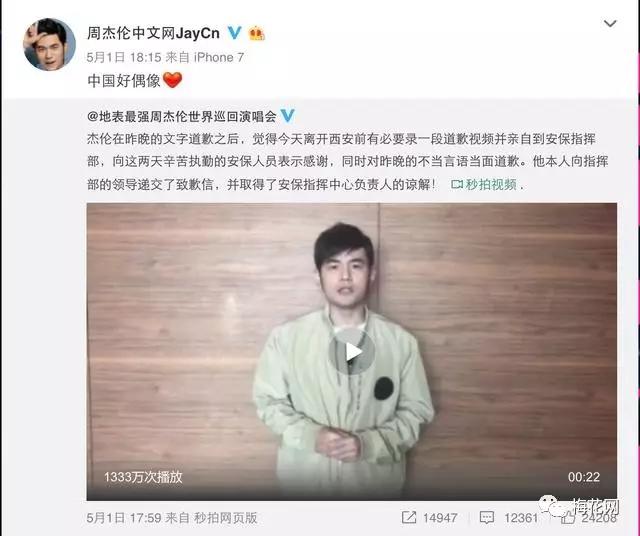 第二步,文字道歉之后,周杰倫錄制了一段道歉的視頻,并親自到安保指揮部,向演唱會期間執(zhí)勤的安保人員表示感謝,同時當(dāng)面向這位安保人員道歉并取得原諒。