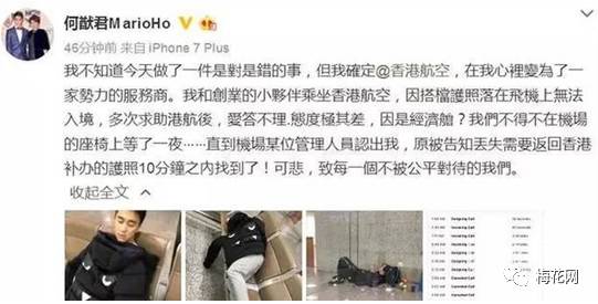 3月13日,香港賭王何鴻燊的四房兒子何猷君在微博上吐槽香港航空,稱自己同機伙伴護照丟在飛機上,香港航空因其是經(jīng)濟艙愛答不理。最后只能露宿機場。
